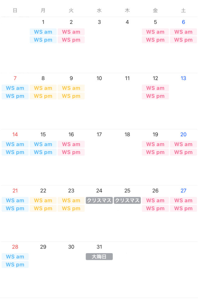 ※新規受講の方は イエロー:佐野智恵子(月曜日のみ)ピンク: 荒木ヨシミ (火・土曜日のみ)でご予約承ります